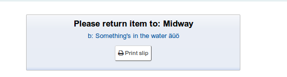 Created attachment 52551 [details] Screenshot: Please return item to: Midway First test I did: Return a checked out item at another branch than it's been checked out from. The button shown doesn't work for me - no visible Javascript error.