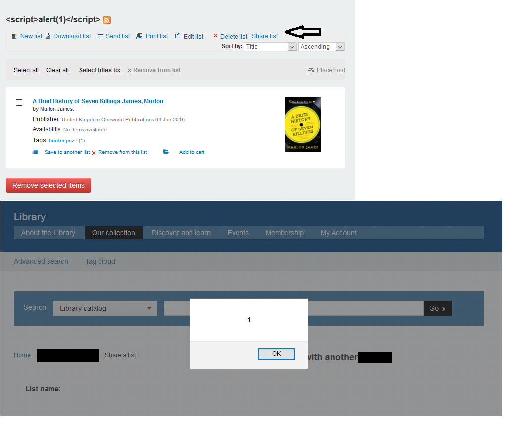 Persistent XSS in Koha 3.2203000, you could save a list in your account with a Script tag for e.g. <script>alert(1)</script>, when you click share the list, the alert window appears.