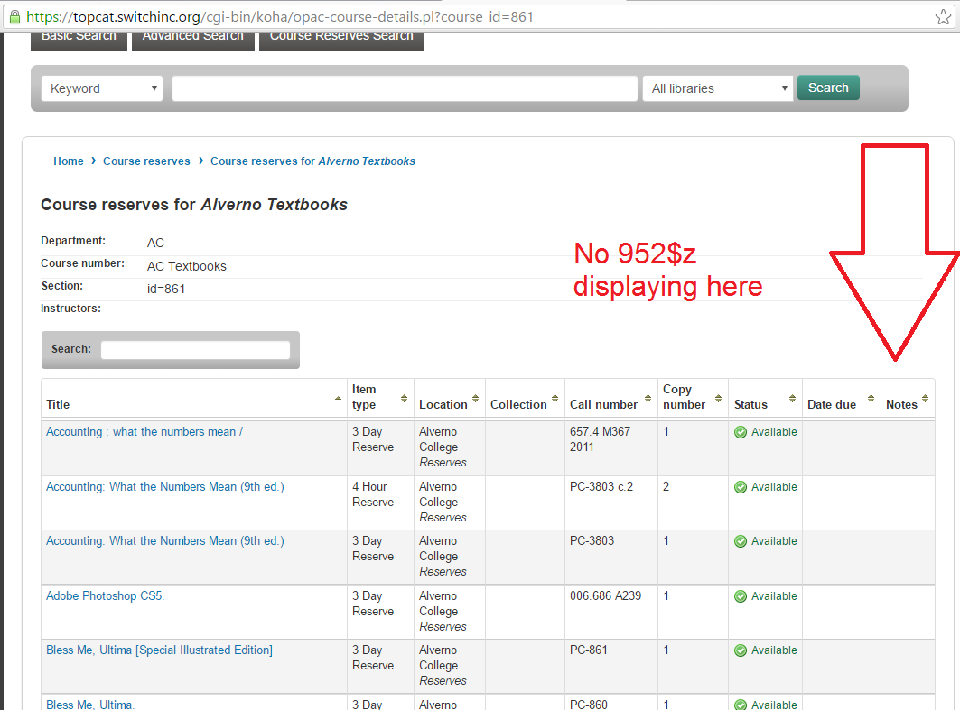 Created attachment 52024 [details] Screenshot of area where notes should display The notes field in the opac-course-details.pl page does not display a 952$z if there is no note in the course reserve. It should fail over and display the 952$z if no notes are present.