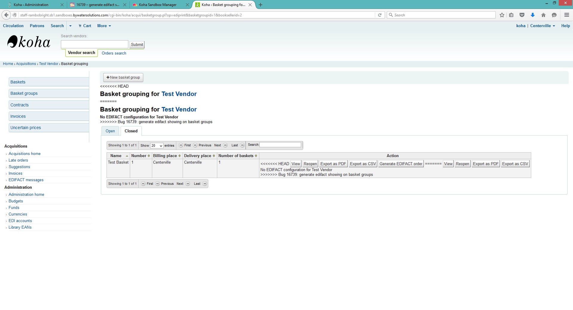 When looking at basketgroups the 'generate edifact order' button shows even if edi isn't set up for that vendor and leads to a 500 error page