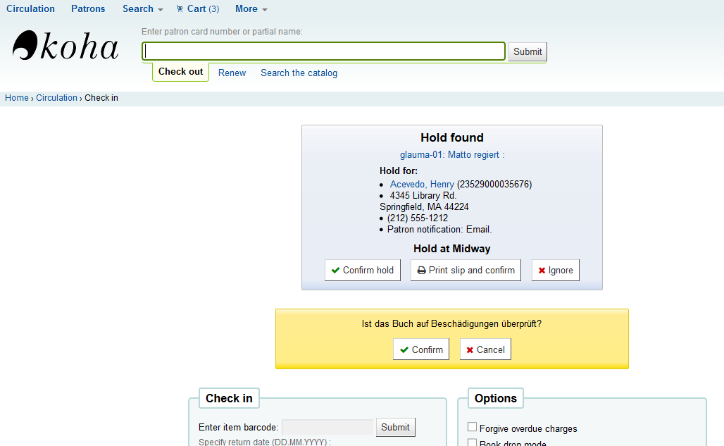 Here should be a new option for checkin message by itemtypes implemented. This new option required a confirmation from the user (over a question which is written there) bevor the item is checked in. The only possible answer for the question are yes or no. By yes the item is checked in, by no it's not checked in. To give an example what is meant here: If you create the item type audiobook, you then can add the Check in Message : "Does envelope and content match?" and for the check in message type: question. So if now a item with the item type audiobook is checked in, the user is ask : "Does envelope and content match?" and got the answer possibiltys yes and no. At this moment he can't read a new barcode, so he must answer the question. If he answer yes the item is check in, if he answer no the item is not check in.
