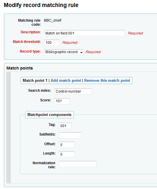 Reproduction of the problem: - Stage and import a MARC21 record that contains data in Field 001. Update the zebra-index if necessary. - Define a record matching rule (in Administration -> Record Matching Rules) on Field 001: Search index = Control-number ; Tag = 001 ; leave Subfield, Offset and Length empty. - Now import the exact same record again, using this matching rule. Expected result: match found Actual result: no match found My gut feeling is that because 001 is a Control Field without any subfields, something goes wrong.
