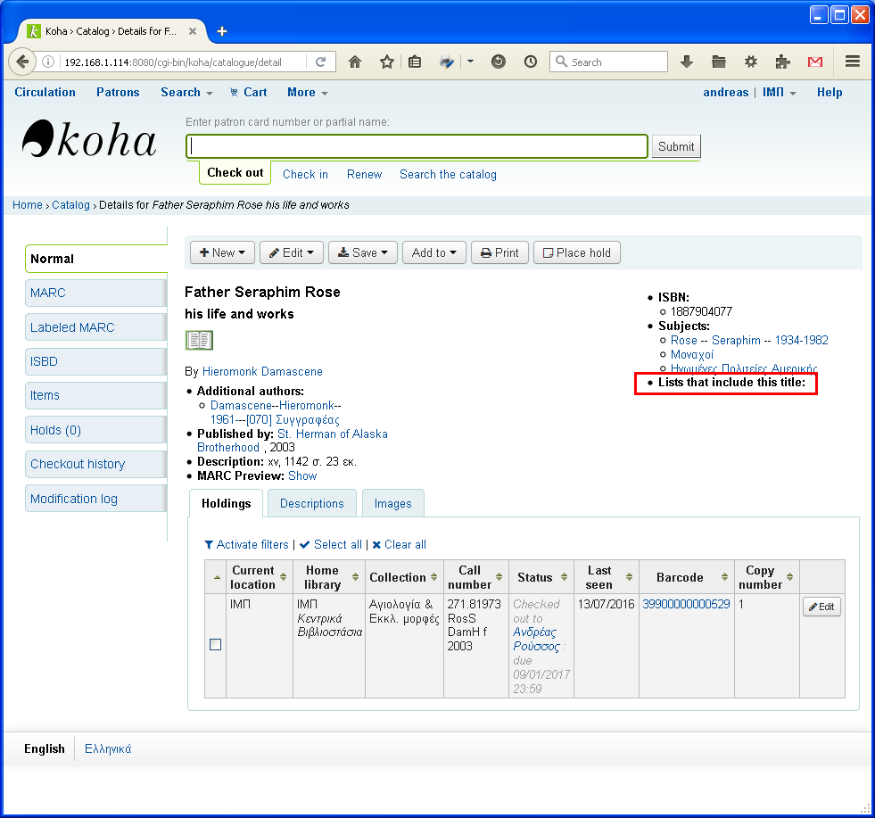 Created attachment 54833 [details] [review] Bug 17185: Staff client shows "Lists that include this title:" even if item is not in a list In the staff client, the text "Lists that include this title:" is always shown, regardless of whether the item is in a list or not. This patch fixes that. Test plan: 1) Log in to staff client. 2) Go to biblio details view: /cgi-bin/koha/catalogue/detail.pl?biblionumber=X Confirm that "Lists that include this title:" is shown even if the item is not in a list. 3) Apply the patch. 4) Repeat step 2. Confirm that the patch works, i.e. "Lists that include this title:" is only shown for biblios that are actually in a list. Signed-off-by: Marcel de Rooy <m.de.rooy@rijksmuseum.nl> Only applies to non-XSLT view.