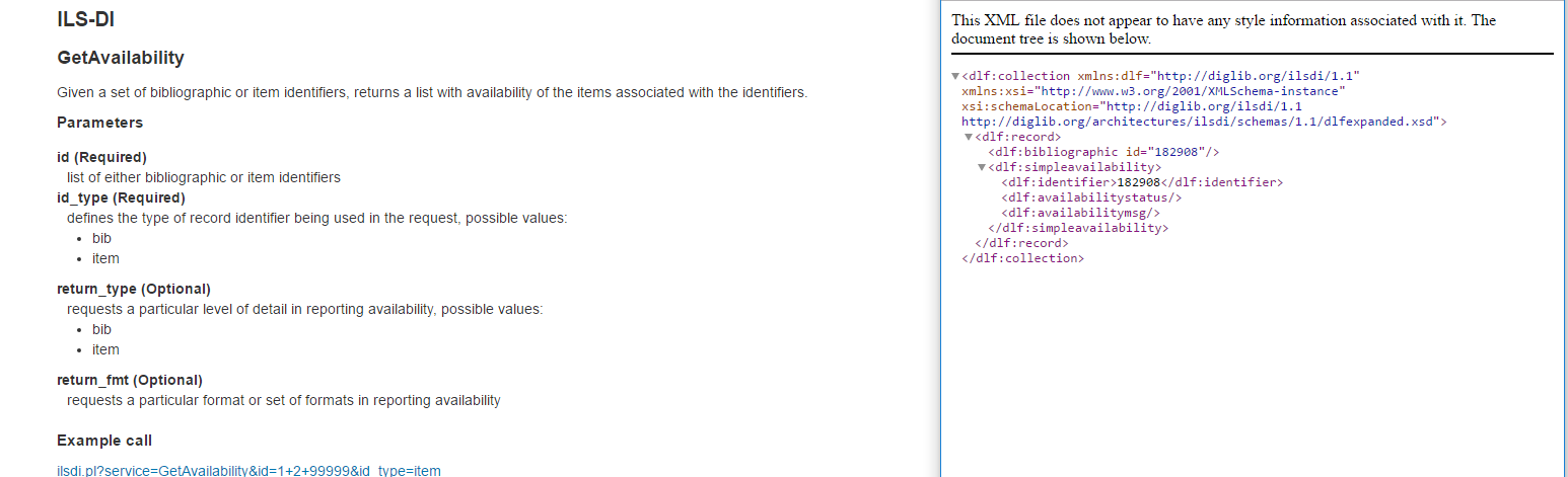 I tested this feature to see if it was safe to go in by not changing the existing behaviour of GetAvailability for 'item'. return_type doesn't seem to be implemented as well? I think that the error page doesn't look good when you give an invalid bibnumber: .../cgi-bin/koha/ilsdi.pl?service=GetAvailability&id=20000&id_type=bib <dlf:collection xsi:schemaLocation="http://diglib.org/ilsdi/1.1 http://diglib.org/architectures/ilsdi/schemas/1.1/dlfexpanded.xsd"><dlf:record><dlf:bibliographic id="20000"/><dlf:items> </dlf:items></dlf:record></dlf:collection> For item it looks like this: <dlf:collection xsi:schemaLocation="http://diglib.org/ilsdi/1.1 http://diglib.org/architectures/ilsdi/schemas/1.1/dlfexpanded.xsd"><dlf:record><dlf:bibliographic id="20000"/><dlf:items><dlf:item id="20000"><dlf:simpleavailability><dlf:identifier>20000</dlf:identifier><dlf:availabilitystatus>unknown</dlf:availabilitystatus><dlf:availabilitymsg>Error: could not retrieve availability for this ID</dlf:availabilitymsg></dlf:simpleavailability></dlf:item></dlf:items></dlf:record></dlf:collection> What do you think? return_type doesn't seem to be implemented as well?