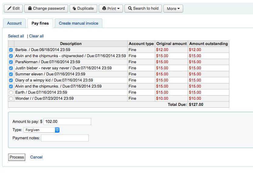 I like it. It is very similar to my request. The one thing I have trouble with is the note. This does not give the option to place individual notes on the individual items. See https://bugs.koha-community.org/bugzilla3/show_bug.cgi?id=17409 for my suggestion and let me know your thoughts. I still think the real estate could be consolidated more by combining the dropdown and process into an action button that defaults to payment. What do you think?