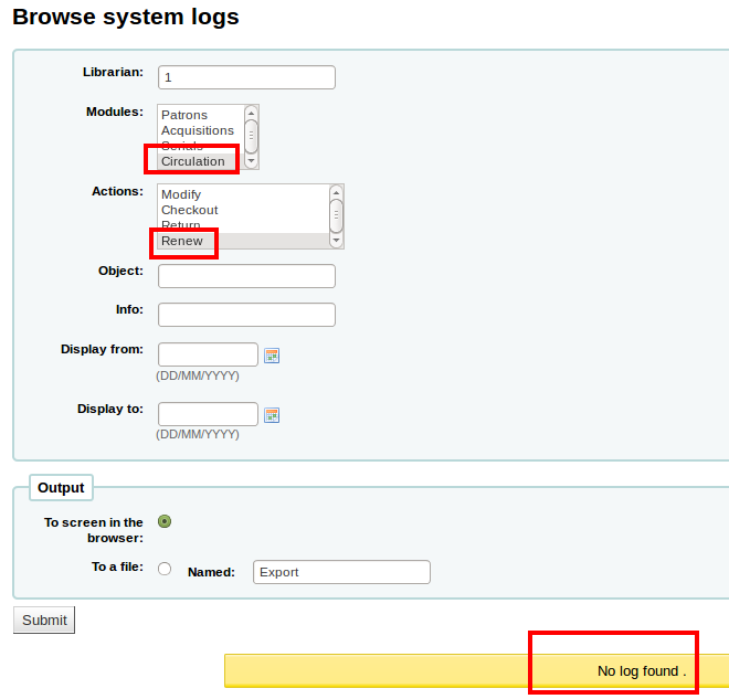 Created attachment 57861 [details] Renewal log Koha version 16.05.5 Tools > Log > Circulation > Renewal does not display result. Please check the screenshots.