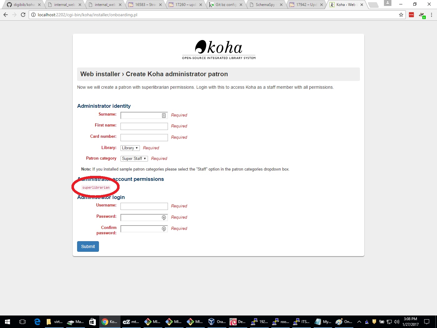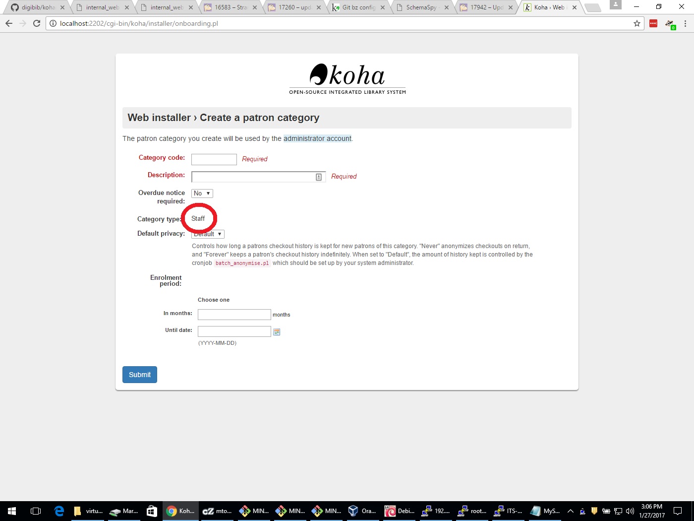 (In reply to Owen Leonard from comment #3) > Because everywhere else in Koha "select all" is a link. Hmmm... it wasn't previously, but I see that has changed. Could we style it pretty like: <a href="#" id="select_all"><i class="fa fa-check"></i> Select all</a> (grabbed from /cgi-bin/koha/members/members-home.pl) No biggie on this. > Since I'm not following along with you I don't know what screen you're > looking at when you make comments. Can you please be specific about where > you're seeing these issues? With just 17855 applied: Create a new patron category (staff) Create koha administrator patron (superlibrarian) With this applied as well: Web installer › Create a patron category (staff) Web installer › Create Koha administrator patron (superlibrarian) Is there a reason to have them differing styles? I sort of expected them the same.
