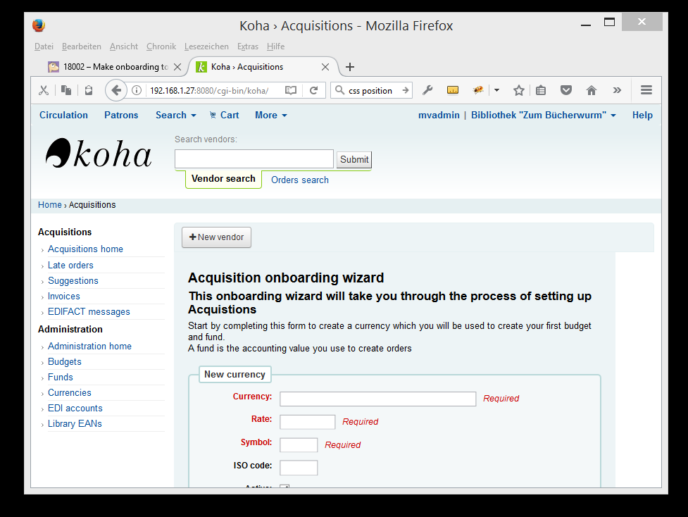 Not sure if this one is valid, but the QA tools get upset about missing POD: FAIL C4/Budgets.pm OK critic OK forbidden patterns OK git manipulation OK pod FAIL pod coverage POD is missing for GetHighestBudgetPeriod OK spelling OK valid Some small stuff from code review: 1) We should not have unconditional warns: Budgets.pm + warn my $data = $dbh->selectrow_array("SELECT MAX(budget_period_id) FROM aqbudgetperiods"); 2) Small typo here: <p>Start by completing this form to create a currency which <strike>you</strike> will be used to create your first budget and fund.<br> 3) Wrong link to the manual - always use http://koha-community... now. <p>Start by completing this form to create a currency which you will be used to create your first budget and fund.<br> 4) Why do you comment out the hint? And why only on one of the 2 date fields? +<!--<div class="hint">[% INCLUDE 'date-format.inc' %]</div>--> 5) Please include current test plans in commit message - otherwise it's often hard to spot the right one and it will help people looking at git later. :) 6) Some little spelling things: Vendor Information page = vendor information page according to our capitalization rules. Also budget administration page etc. Some more from testing, overall the feature works alright and is a nice addition. I am mostly concerned about the next point: 6) Wondering: Is there no way to skip the Onboarding process from the installer? Or the Acquisitions onboarding? People who have done this a lot of times before might want to skip the process. Because you want to add more currencies at the same time, add your whole fund structure etc. I would like it better if it was visible, but less invasive maybe? Also: Some libraries never set up acq, but need to be able to manage vendors in acquisitions. So it might be nice if the onboarding tool could be hidden if not needed. Some ideas: - Don't show the onboarding tool if the user has only vendor_manage permission. - Only show the onboarding tool, if the user has full acq permissions or is a superlibrarian. - I am not sure how helpful the 'next steps' are. Maybe they would be better suited to go into the manual or help file? As it is the bug button always remains visible, even if you are a power user of acq.