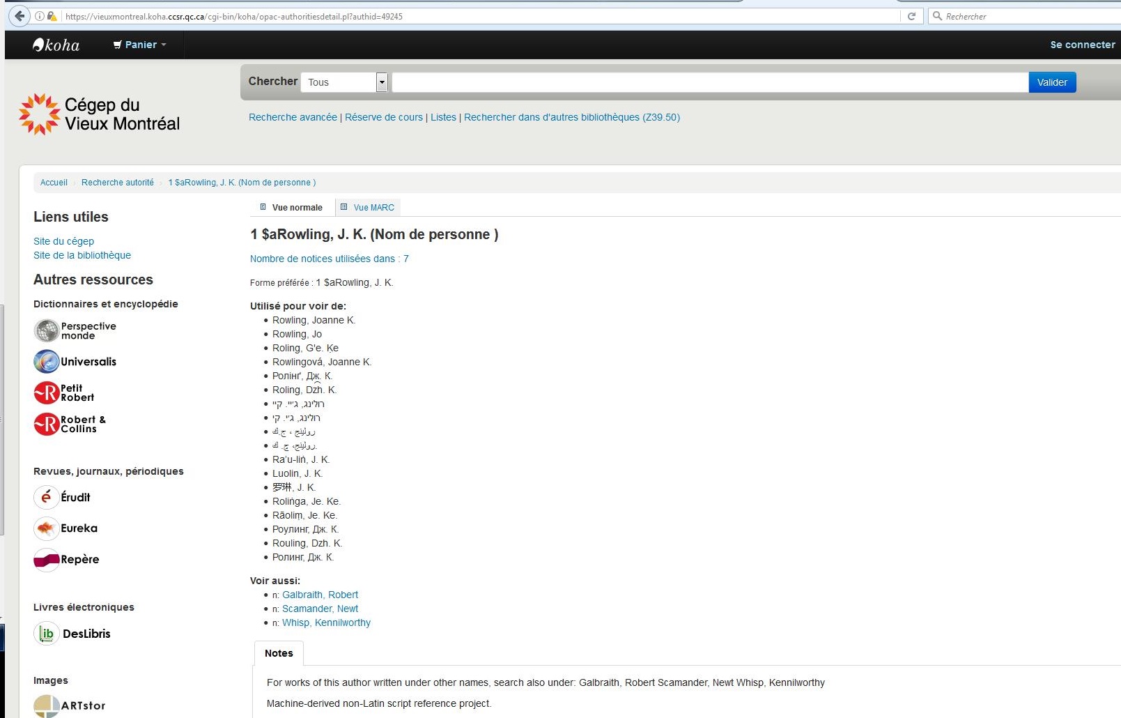 Created attachment 59754 [details] Page with "see also" links ("Voir aussi :") It's probably a minor bug. If you make a search with this author, your search will normally give you the records linked to the pseudonyms of the name. But in our searches, these pseudonyms records don't appear in the results of an author search even if the links "see also" were created previously. I will take an example that almost all of us will know. The author of Harry Potter wrote under many names : Robert Galbraith, Newt Scamander and Kennilworthy Whisp. All these names are normally linked between them by a "see also" mention. (The link must be done previously during cataloging. Sadly, not so many of us did all this up here.) Here is the way to check if you have links "see also" already created. 1) In an OPAC, make a search with J. K. Rowling 2) Observe that all results are directly related to J. K. Rowling 3) Clic on a book writen by this author (not a movie) 4) Just under the title of the record, you have the mention "author" with a magnifying glass, clic on the magnifying glass 5) You will see all forms the name can take and under we have the "see also" mentions (if created) 6) If they are created, you can clic normally on these names. 7) A page appears with a mention something like "Authorities search results" (we have it in french) 8) In the third column of the board, it's indicated "Bibliographic records", you can clic on the results just under ("x documents") 9) In my particulary case, I took Robert Galbraith for which we have 3 records (maybe they are more) : Career of evil, Silkworm and Cuckoo's calling. 10) If I return to my first results for J. K. Rowling, I cannot see these three books anywhere... Records with a pseudonym name (in the "see also" links) should appear in the record results of an author. Some people here suggest to create a system preference like "IncludeSeeFromInSearches" to find the records in the "see also" links. Thanks, Alexandre from CCSR