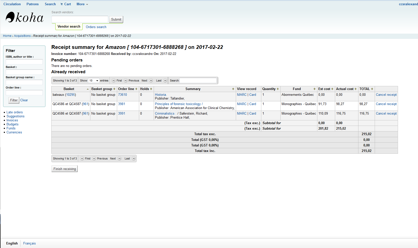 Created attachment 60623 [details] No notes for already received orders Hi, someone have reported something like a minor bug. 1) Go to acquisition module 2) Make a vendor search, Amazon for example 3) Create a new basket for it 4) Create a new order in it 5) Add an internal and a vendor note and save them 6) Close your basket 7) Return to the vendor basket(s) page and clic on "Receive shipment", then clic on your order on the board and clic on "Finish receiving" 8) Create a new invoice for the order (complete "Vendor invoice", "Shipping cost" and "Shipping fund"), clic "Next" and then clic "Save" 9) Return to "Pending orders" board to observe that internal and vendor infos appear 10) Clic on "Receipt" the order on the right 11) Clic on the "Receive?" case and save 11) The system will return on Receipt summary page and observe that the said infos don't appear anymore on the "Already received" board These notes are usefull to staff clients when they make a fast check up on received orders.