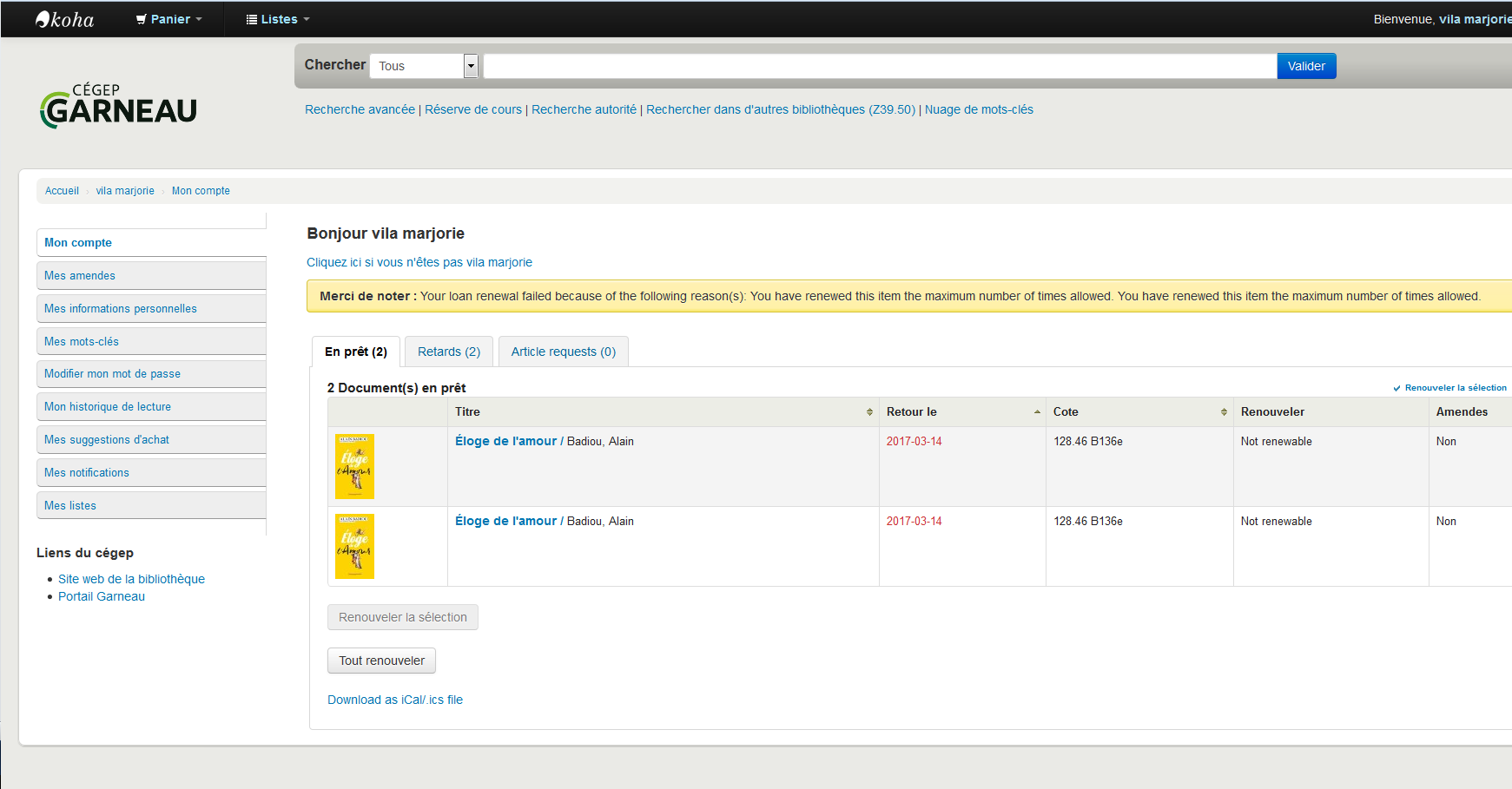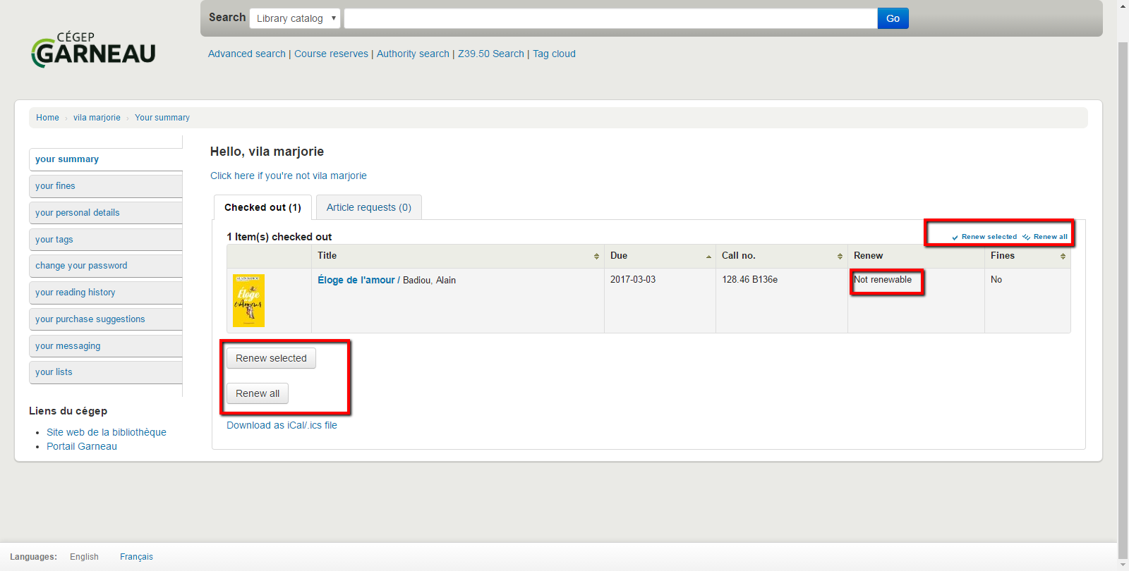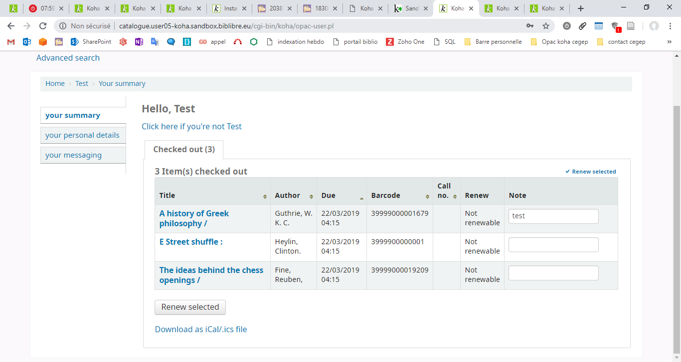 (In reply to Owen Leonard from comment #12) > (In reply to Marjorie Barry-Vila from comment #10) > > > even if all my checkout are not renewable. > > Why are your checkouts not renewable? I used all the renewals available according to the circulation rules. Marjorie