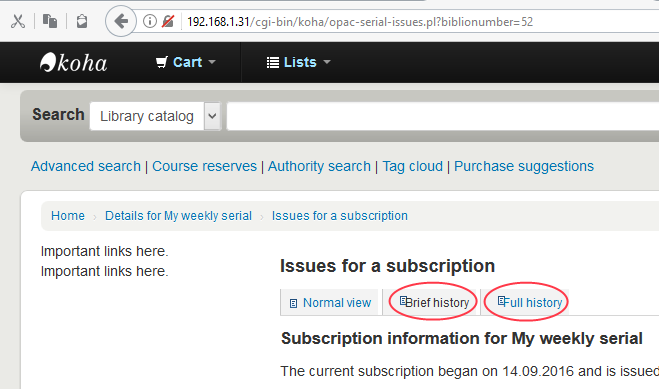 Created attachment 61868 [details] Strange display of tabs in subscription details (OPAC) Tabs do not display correctly in /cgi-bin/koha/opac-serial-issues.pl?biblionumber=nn To reproduce, create a subscription, then display serial in OPAC: Home > Details for [My serial] > Issues for a subscription See screenshot attached. Reproduced with Firefox and IE, same display.