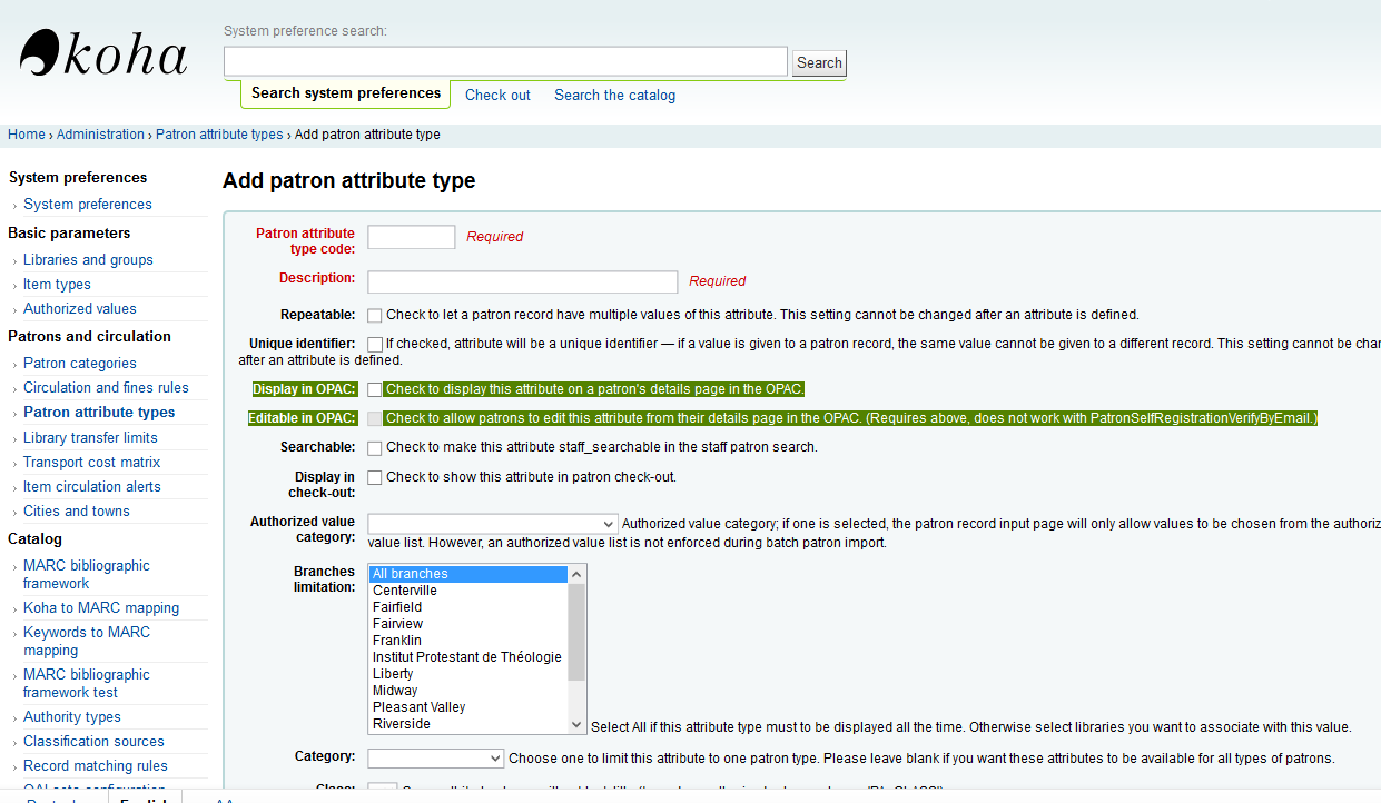 Editable in OPAC: Check to allow patrons to edit this attribute from their details page in the OPAC. This above option could not be found. snapshot required