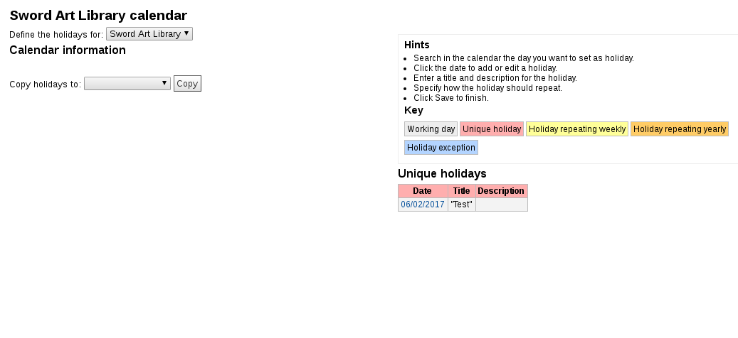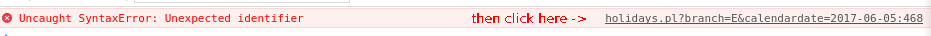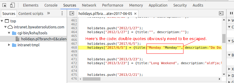 To replicate: 1/ Go to Tools > Calendar 2/ Click on a date 3/ Enter a title with text enclosed in double quotes "like this". 4/ Click Save This will cause a JavaScript error that prevents the calendar from displaying: holidays.pl?branch=CPL&calendardate=2017-05-01:382 Uncaught SyntaxError: Unexpected identifier Here's an example of the code that's erroring out: holidays["2017/5/1"] = {title:"This will cause "failure". ", description:"asdf"}; The problem is that the quotes are not escaped.