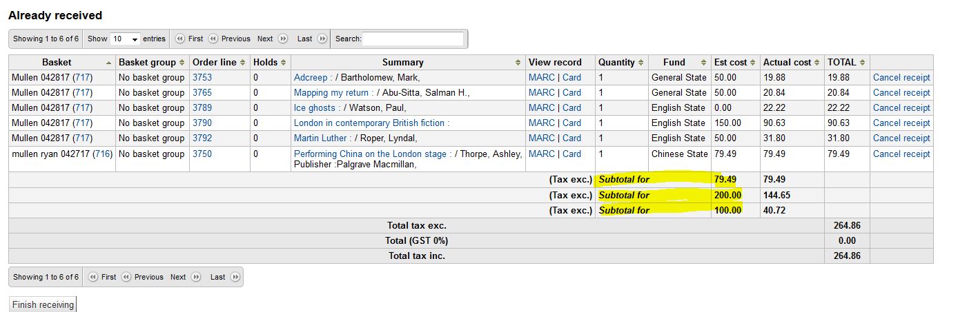 Created attachment 63939 [details] Example of fund name missing When viewing an invoice in acquisitions, in the Already received section the Subtotals do not list the fund name, simply states "Subtotal for".
