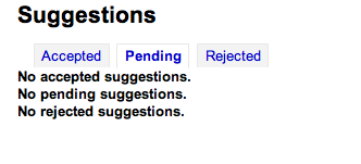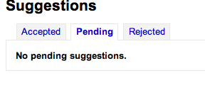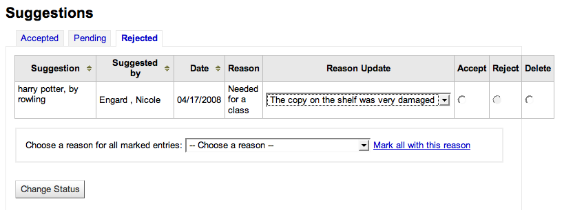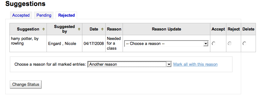 ---- Reported by nengard@gmail.com 2008-02-25 15:55:10 ---- If you accidentally approved or rejected a suggestion, then there is no way to edit the suggestion after the fact. ---- Additional Comments From henridamien@koha-fr.org 2008-03-15 15:01:30 ---- Patch sent to Owen for some js improvements. ---- Additional Comments From henridamien@koha-fr.org 2008-04-17 01:09:40 ---- Patch sent on 14-04 ---- Additional Comments From nengard@gmail.com 2008-04-17 06:43:45 ---- When changing status it doesn't seem to change what appears under the reason - see image one - after changing the pull down and clicking submit it stays the same. Also, when I click mark all with this reason nothing happens - see image 2 Lastly, after I change a rejected order it brings me back to the pending tab - making me click on rejected again - not terribly user-friendly ---- Additional Comments From nengard@gmail.com 2008-04-17 06:44:08 ---- Created an attachment reason not changing ---- Additional Comments From nengard@gmail.com 2008-04-17 06:44:34 ---- Created an attachment mass changing isn't working ---- Additional Comments From nengard@gmail.com 2008-04-17 06:46:07 ---- Another note - my manage suggestions page looks different from HDL's - I actually like the way mine looks better - but either way - it's not all the same. See two images. ---- Additional Comments From nengard@gmail.com 2008-04-17 06:46:42 ---- Created an attachment hdl's has no for all three on the pending tab ---- Additional Comments From nengard@gmail.com 2008-04-17 06:47:20 ---- Created an attachment mine shows no for the tab you're on - no pending ---- Additional Comments From nengard@gmail.com 2008-04-17 06:47:41 ---- Created an attachment mine shows no for the tab you're on - no accepted ---- Additional Comments From nengard@gmail.com 2008-04-24 10:18:40 ---- I can now update reasons en-mass, but I still don't see any accepted suggestions - even if I have accepted some. Also, when I visit the rejected page the reasons for rejecting (that I entered on the pending tab) are not displaying. ---- Additional Comments From nengard@gmail.com 2008-04-24 10:23:46 ---- Nevermind my comment about approved items not showing up - that works, but when I visit the rejected page the reasons for rejecting (that I entered on the pending tab) are not displaying. ---- Additional Comments From henridamien@koha-fr.org 2008-04-24 10:24:49 ---- Have you upgraded yui ? ---- Additional Comments From nengard@gmail.com 2008-04-24 10:44:14 ---- from josh: the answer is yes :-) did you shift-refresh is another question. ---- Additional Comments From nengard@gmail.com 2008-04-24 10:45:34 ---- Okay - I figured it out. Here are the steps Reject a suggestion Suggestion appears on rejected tab with reason Delete a rejected suggestion Suggestion no longer has a reason attached to it ---- Additional Comments From jmf@liblime.com 2008-05-19 12:55:12 ---- Marking this as fixed, thanks Henri-Damien! --- Bug imported by chris@bigballofwax.co.nz 2010-05-21 00:35 UTC --- This bug was previously known as _bug_ 1879 at http://bugs.koha.org/cgi-bin/bugzilla3/show_bug.cgi?id=1879 Imported an attachment (id=394) Imported an attachment (id=395) Imported an attachment (id=396) Imported an attachment (id=397) Imported an attachment (id=398) Actual time not defined. Setting to 0.0 The original submitter of attachment 394 [details] is unknown. Reassigning to the person who moved it here: chris@bigballofwax.co.nz. The original submitter of attachment 395 [details] is unknown. Reassigning to the person who moved it here: chris@bigballofwax.co.nz. The original submitter of attachment 396 [details] is unknown. Reassigning to the person who moved it here: chris@bigballofwax.co.nz. The original submitter of attachment 397 [details] is unknown. Reassigning to the person who moved it here: chris@bigballofwax.co.nz. The original submitter of attachment 398 [details] is unknown. Reassigning to the person who moved it here: chris@bigballofwax.co.nz.
