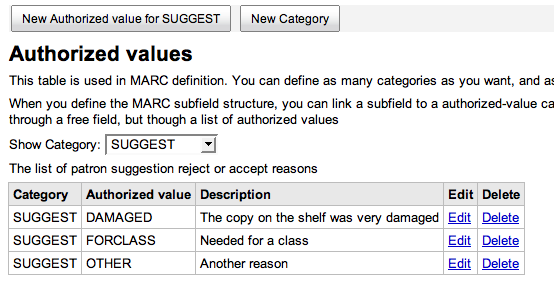 I can submit a patch which would add a couple of default suggestion reasons via updatedatabase.pl: INSERT INTO authorised_values (category,authorised_value,lib,lib_opac) VALUES ('OPAC_SUG','damaged','The copy on the shelf is damaged','The copy on the shelf is damaged INSERT INTO authorised_values (category,authorised_value,lib,lib_opac) VALUES ('OPAC_SUG','bestseller','Upcoming title by popular author','Upcoming title by popular author Anyone have objections or suggestions?