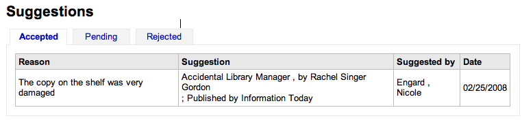 ---- Reported by nengard@gmail.com 2008-02-25 16:03:14 ---- When in an academic setting for example the librarians may want to know that a professor is requesting a book for a class. Or they may want to know that someone found a damaged book and a new one should be ordered. Since there is a list why librarians approve/reject requests, it would also be nice if patrons had the ability to explain why they were requesting a book. ---- Additional Comments From nengard@gmail.com 2008-02-25 16:03:46 ---- Created an attachment originally i thought that SUGGEST was for the user - and I came up with this list ---- Additional Comments From nengard@gmail.com 2008-03-06 05:00:14 ---- Created an attachment 1 - approved suggestion ---- Additional Comments From nengard@gmail.com 2008-03-06 05:00:50 ---- Created an attachment 2 - order from vendor ---- Additional Comments From nengard@gmail.com 2008-03-06 05:01:13 ---- Created an attachment 3 - order from suggestion --- Bug imported by chris@bigballofwax.co.nz 2010-05-21 00:35 UTC --- This bug was previously known as _bug_ 1883 at http://bugs.koha.org/cgi-bin/bugzilla3/show_bug.cgi?id=1883 Imported an attachment (id=400) Imported an attachment (id=401) Imported an attachment (id=402) Imported an attachment (id=403) Actual time not defined. Setting to 0.0 CC member bchurch@ptfs.com does not have an account here The original submitter of attachment 400 [details] is unknown. Reassigning to the person who moved it here: chris@bigballofwax.co.nz. The original submitter of attachment 401 [details] is unknown. Reassigning to the person who moved it here: chris@bigballofwax.co.nz. The original submitter of attachment 402 [details] is unknown. Reassigning to the person who moved it here: chris@bigballofwax.co.nz. The original submitter of attachment 403 [details] is unknown. Reassigning to the person who moved it here: chris@bigballofwax.co.nz.