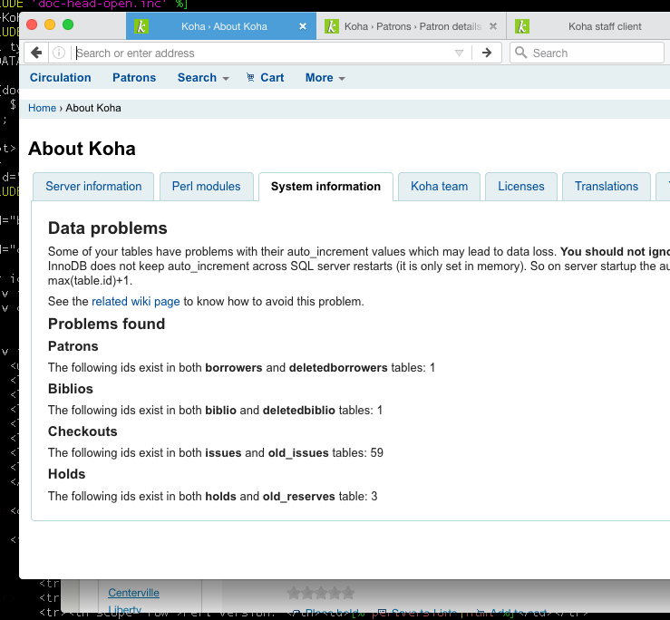 If MySQL AUTO_INCREMENT messed ids (See https://wiki.koha-community.org/wiki/DBMS_auto_increment_fix), we should add a warning on the about page.