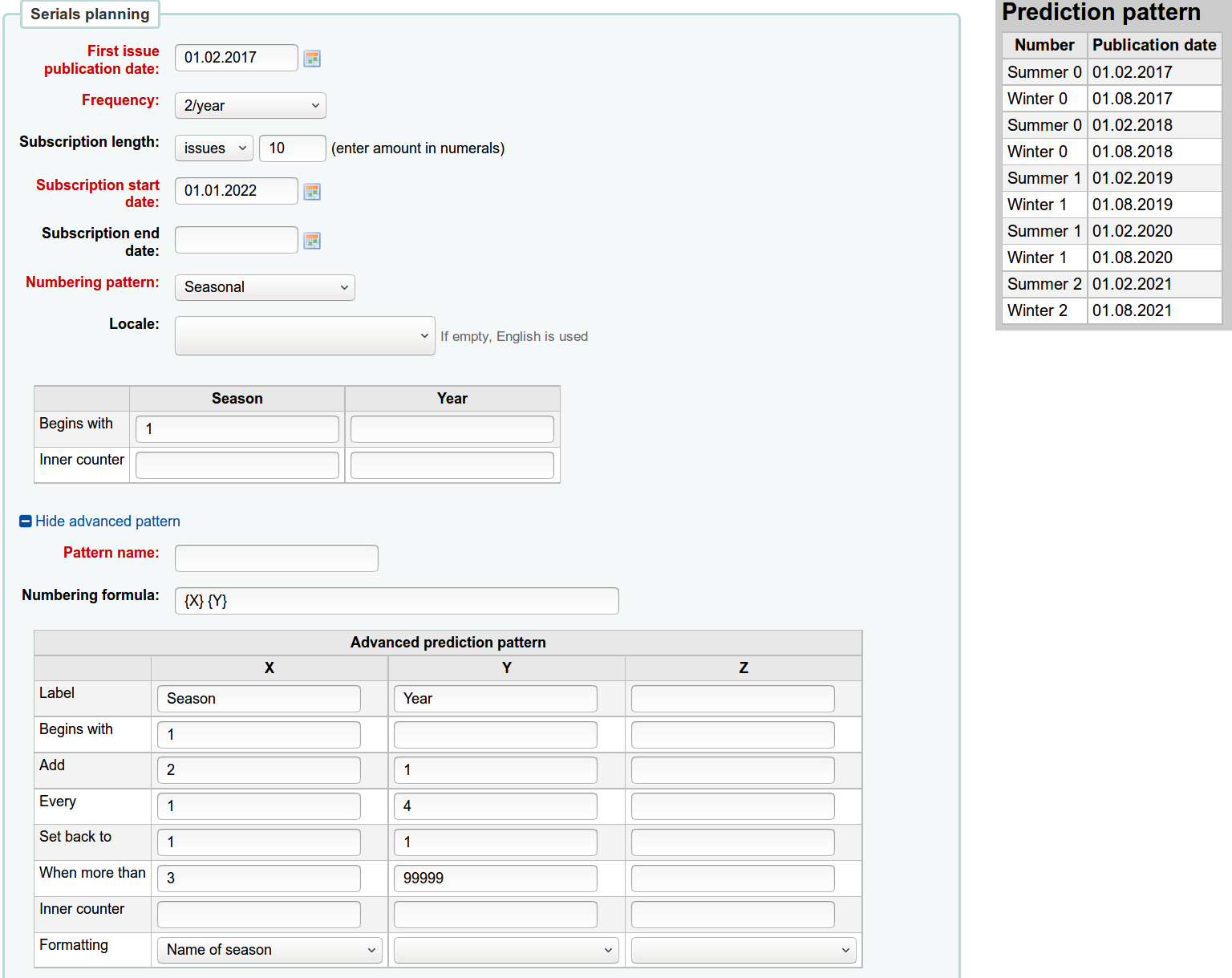 The seasonal pattern for a 2x a year frequency does not work as expected. When using a serial that is a Summer & Winter frequency. If starting the serial with the Summer Issue, setting the last value and inner counter will only default to a Spring start in the test pattern. Setting the last value as any season, will still default to a spring start to the test pattern. The test pattern will adjust after the first two issues- Spring Fall, Summer, Winter, Summer, Winter, etc - but Koha insists on starting this pattern with Spring.
