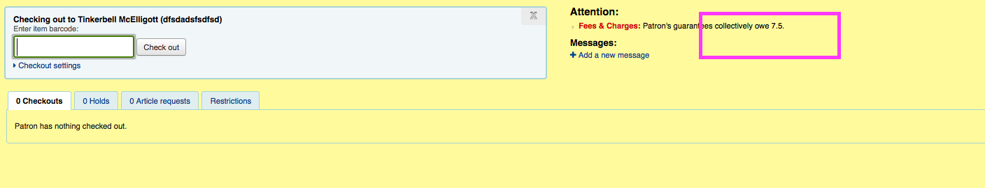 My apologies, I missed some steps, you need to have NoIssuesChargeGuarantees set to make the message show: Add steps: 2.5 - Set system preference 'NoIssuesChargeGuarantees' to '0' (or just make sure patrons have more than the number you set) 4.5 - Check display with both values of system preference 'AllowFineOverride'