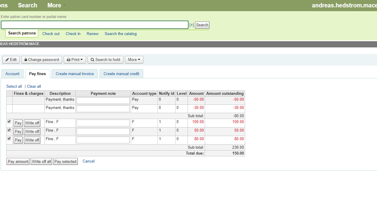 Created attachment 66616 [details] Fines total amount The "Pay selected" option on the Fines tab in the borrower account page doesn't work as intended. The problem has been noted on both 16.05.00 and on master, but behaves a bit differently. On 16.05 the amount paid will be drawn from the total amount rather than the selected fine, while on master the fine on top of the list gets the amount deducted, even if another fine is choosen from the list. To recreate: 1) Create two or three fines, using the Create manual invoice function. 2) Choose one of the fines (not the one on the top) and click Pay selected 3) Pay a partial amount 4) Go back to the Pay fines tab an notice that the fine you selected has not changed. Instead, either the top fine or the total (see attachment) has ben affected.