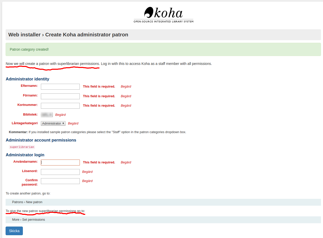 Read: To create another patron, go to Patrons > New patron To give the new patron superlibrarian permissions go to... It's for the permissions of new patrons you are going to create manually.