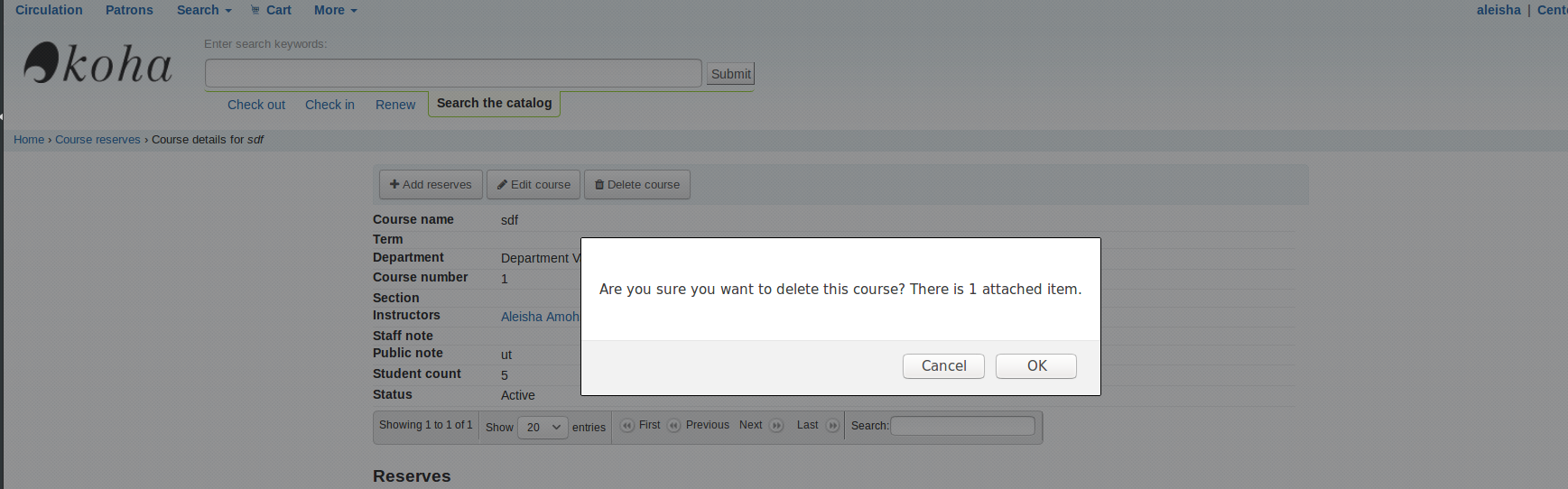 Created attachment 67071 [details] [review] Bug 19231: Add number of attached items to confirm message when deleting course To test: 1) Ensure UseCourseReserves is enabled 2) Go to Course Reserves and create 3 new courses 3) Add one item to a course, add two items to another course, and add no items to the third course 4) Delete the course with no items. Confirm the error message shows up. No need to say how many attached items there are here (because there are none). 5) Delete the course with one item. Confirm the error message shows and warns of the one attached item and makes grammatical sense 6) Delete the course with two items. Confirm the error message shows and shows the correct number of attached items and makes grammatical sense 7) Confirm clicking 'Cancel' and 'OK' does what is expected Sponsored-by: Catalyst IT Signed-off-by: Claire Gravely <claire.gravely@bsz-bw.de> Looks good!