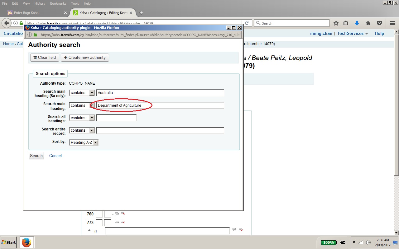 Names after ampersand (&) are ignored for cataloguing authority searching. For example: Australia. Department of Agriculture & Environment (as appeared in the cataloguing record) will appear in the cataloguing authority search screen as: Australia. Department of Agriculture See attached pictures.