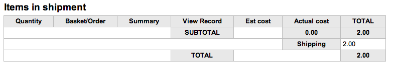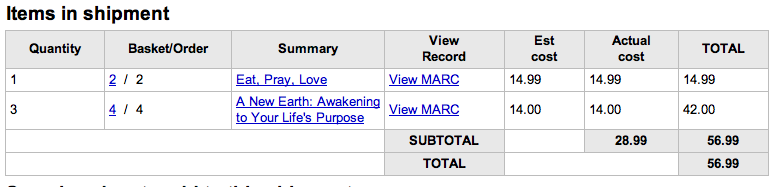 ---- Reported by nengard@gmail.com 2008-03-21 07:37:28 ---- When I marked an order received the shipping costs were listed in the subtotal, and after I add items to the list the shipping goes away. See attached screenshots. ---- Additional Comments From nengard@gmail.com 2008-03-21 07:37:46 ---- Created an attachment shipping showing ---- Additional Comments From nengard@gmail.com 2008-03-21 07:38:07 ---- Created an attachment shipping gone ---- Additional Comments From jmf@liblime.com 2008-05-19 13:41:23 ---- This is a blocker if I've ever seen one. ---- Additional Comments From rch@liblime.com 2008-06-20 14:00:36 ---- Unfortunately, the current db schema is not going to reliably handle shipping costs, so freight charges will have to be managed outside of Koha for 3.0. This requires a db schema change, likely adding at least two tables to represent invoices and shipments. I will remove the frieght from the display and mark this as WONTFIX, as more than one large scale acq project is in the works now. ---- Additional Comments From rch@liblime.com 2008-06-20 16:06:16 ---- Marked as WONTFIX for now. Shipping is removed from the interface. --- Bug imported by chris@bigballofwax.co.nz 2010-05-21 00:36 UTC --- This bug was previously known as _bug_ 1965 at http://bugs.koha.org/cgi-bin/bugzilla3/show_bug.cgi?id=1965 Imported an attachment (id=443) Imported an attachment (id=444) Actual time not defined. Setting to 0.0 The original assignee of this bug does not have an account here. Reassigning to the default assignee for the component, chris@bigballofwax.co.nz. Previous assignee was rch@liblime.com. The original submitter of attachment 443 [details] is unknown. Reassigning to the person who moved it here: chris@bigballofwax.co.nz. The original submitter of attachment 444 [details] is unknown. Reassigning to the person who moved it here: chris@bigballofwax.co.nz.