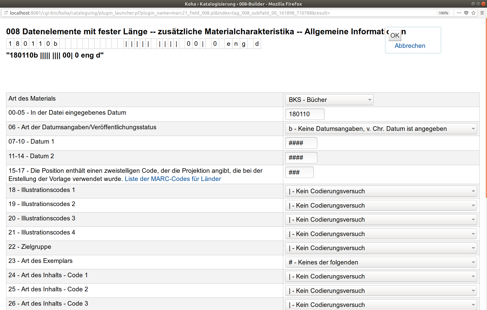 Created attachment 70481 [details] screenshot de-DE Bug 19413 moved the buttons in the cataloguing plugins to the top, this doesn't work well for translations where the terms 'cancel' and 'ok' can be longer.