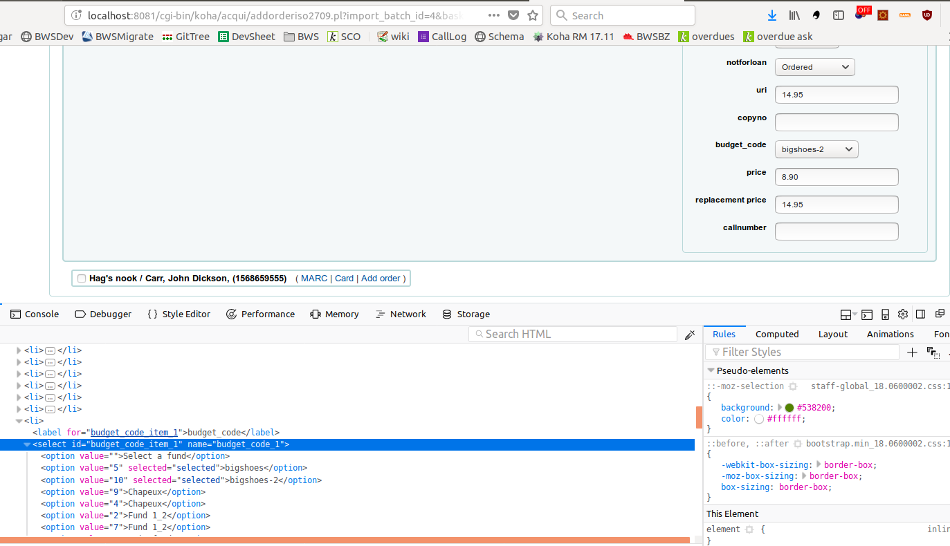 (In reply to Charles Farmer from comment #4) > > 975 from record: > > =975 \\$7-1$8b$cO$g8.90$hSHOES$p8.90$q1$u14.95$v14.95$yBOOK > > > > You will need to adjust subfield $h to the name of on of your funds that is > > duplicated > > This will definitely have to be rephrased, because like Zoe Bennett, I > couldn't reproduce the issue. > > I did as you said, created two budgets, with one fund that had the same > code, and yet, when I used the staged file to add items to a new basket, > there was only one budget name in the dropdown menu. I added an example file and screenshots, I changed the fund name to show that both are selected, the problem persists if the names are the same or different