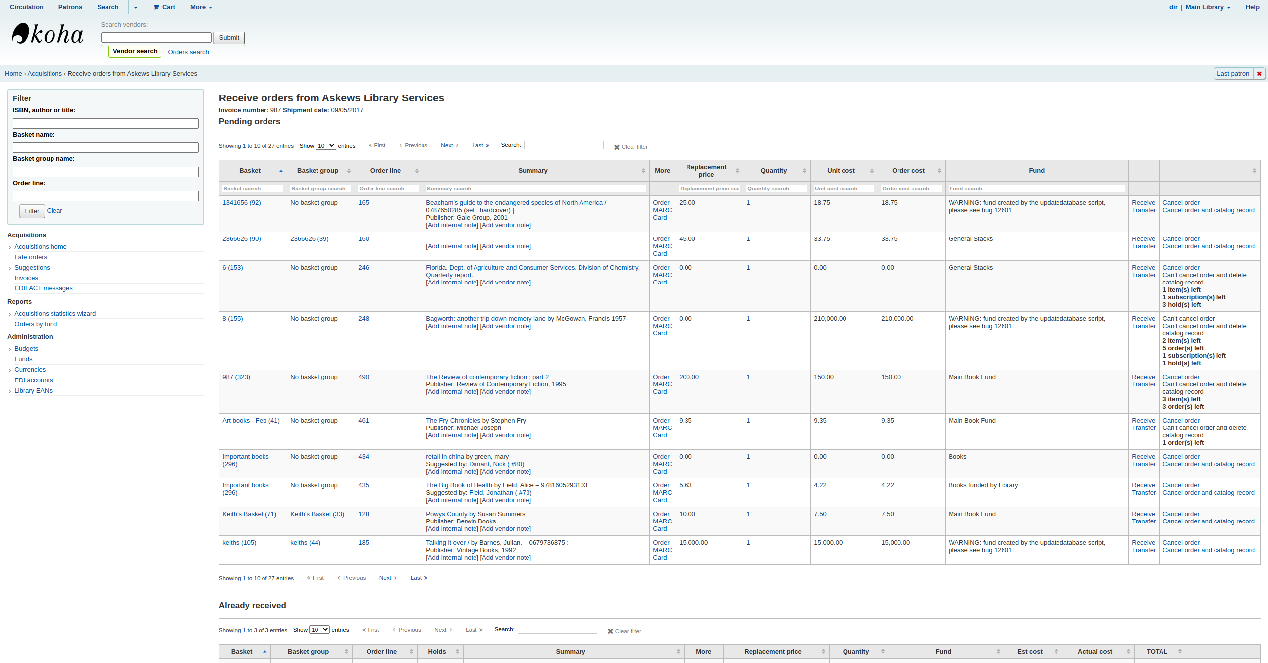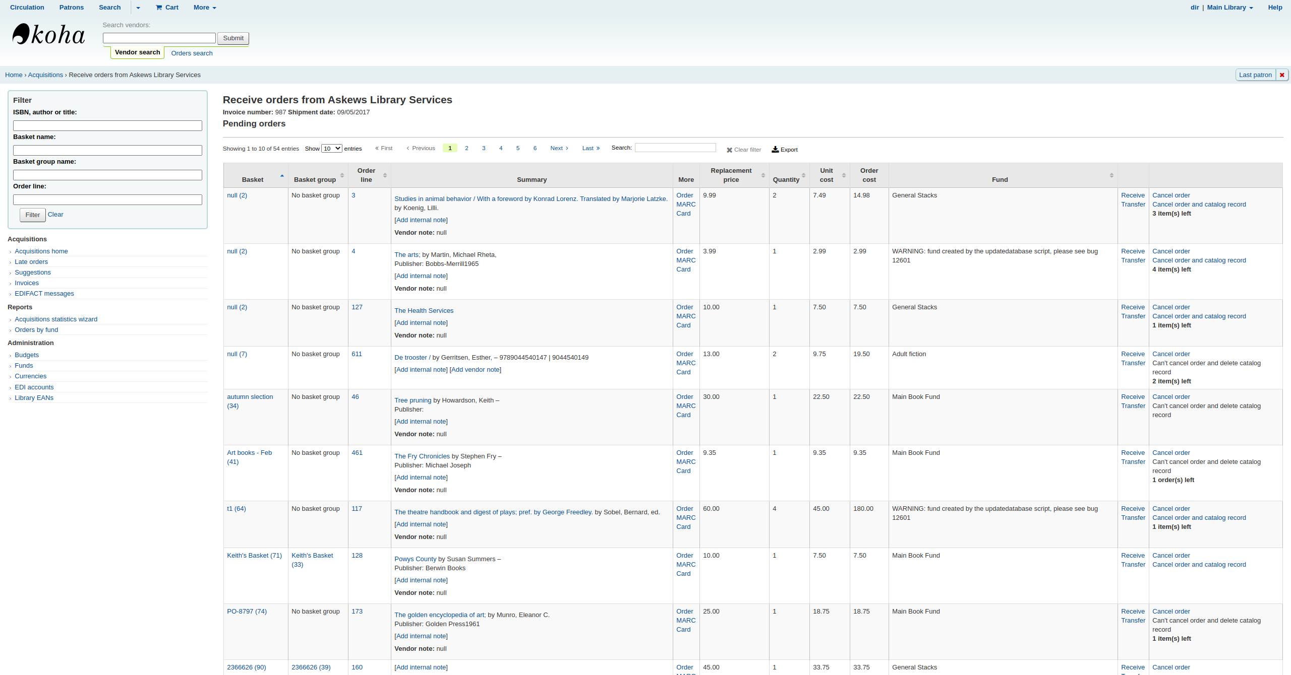 (In reply to Katrin Fischer from comment #182) > I was wondering about the removed search options on the left: Are there any > issues to be expected performance wise? As I understand if you can't limit > by search, you will always filter on the full data by using the datatable > options? Searches are very fast (at least compared to the original implementation). The key, to streamline the receiving process, will be bug 8179, which will let the users perform several queries and accumulate to orders to receive, so they are all received in one step.