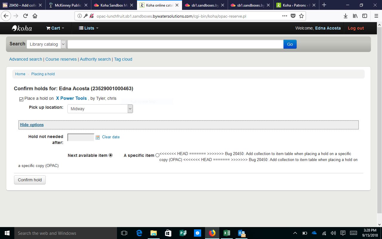 Created attachment 78888 [details] screenshot of the OPAC results The staff interface works as planned. The OPAC does not. The attached image shows the problem. This text that shows in the results is: <<<<<<< HEAD ======= >>>>>>> Bug 20450: Add collection to item table when placing a hold on a specific copy (OPAC) <<<<<<< HEAD ======= >>>>>>> Bug 20450: Add collection to item table when placing a hold on