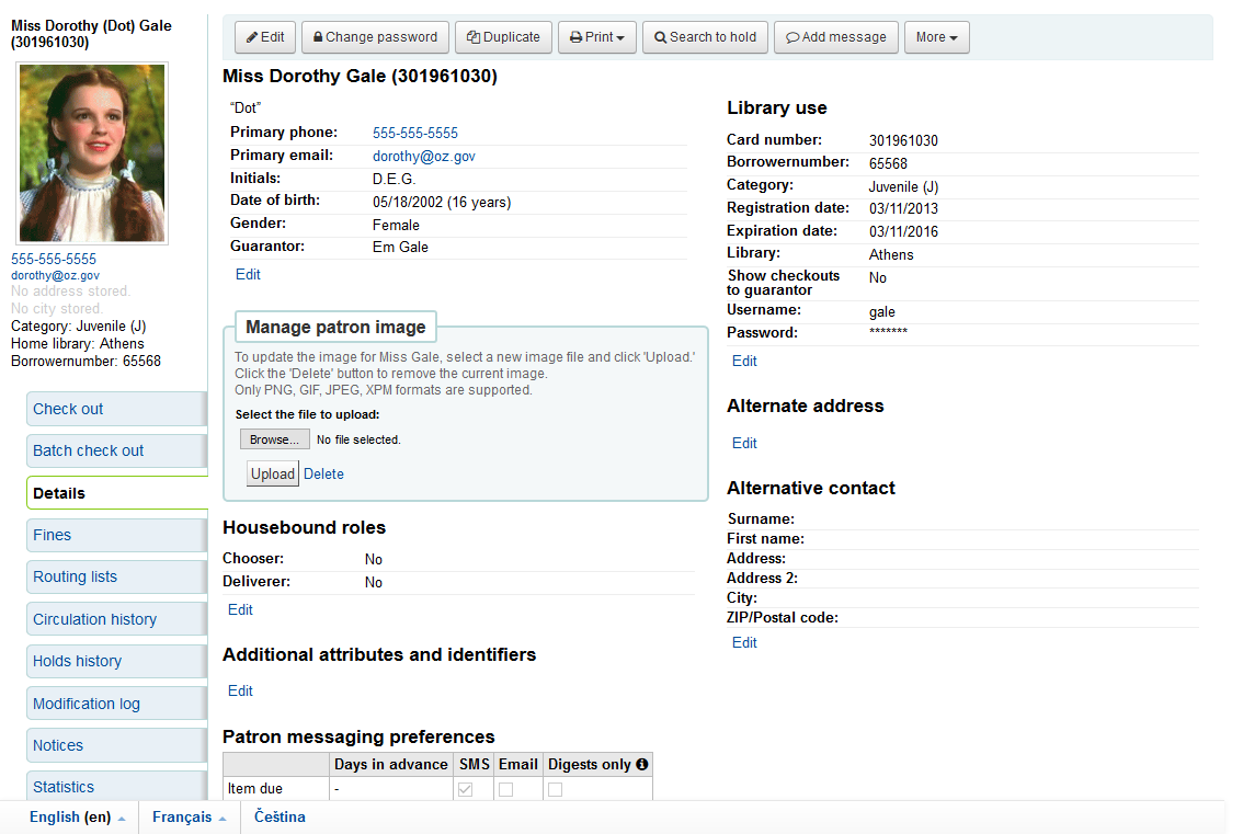 Created attachment 75436 [details] [review] Bug 20779 - Style refresh for patron detail page This patch makes style and markup changes to the patron detail page template in order to make the display of information somewhat more compact and to increase the visibility of the edit controls. To test you should enable the patronimages system preference. Apply the patch and view the detail page for a patron. - Check that the page looks correct and that sections like "Alternate address" and "Alternative contact" are empty when there is no data. - Check that the "Manage patron image" tool works correctly.