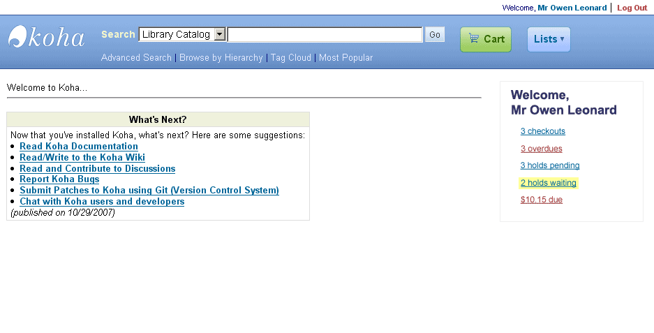 Hi Aleisha, I have tested this a bit and only some small comments: - Welcome, <name> always displays, even if there is no other information to be displayed below. I think I'd either not display it, if there is no more information to show or show the other entries with 0/no - 5.00 due = To make it a little easier to translate, I suggest to change it a bit, maybe 5.00 due in fines and charges (if that is English...). Single small words with multiple meanings are often hard to translate right. Making it more specific would help. Adding Owen for ideas on the styling!