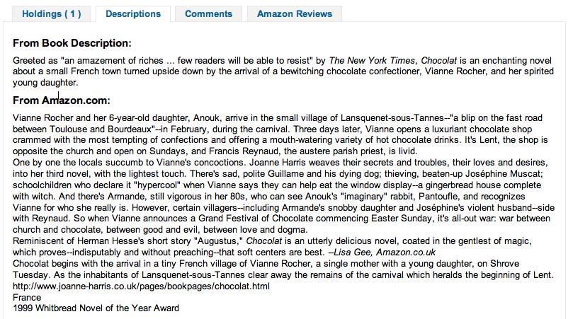 ---- Reported by nengard@gmail.com 2008-05-09 07:46:04 ---- You'll have to see my screenshots, but with Amazon content turned on the descriptions coming from the catalog get long. Along with that, it's hard to tell where the different descriptions are coming from. In my screenshots, it's the 520, 522, and 586. Maybe we can put bold labels on each 5xx that comes from the catalog so that we know what each is. So for 586 it could say <b>Awards:</b> or something like that. ---- Additional Comments From nengard@gmail.com 2008-05-09 07:46:24 ---- Created an attachment opac view ---- Additional Comments From nengard@gmail.com 2008-05-09 07:46:45 ---- Created an attachment cataloging view ---- Additional Comments From oleonard@myacpl.org 2008-05-22 08:59:38 ---- I'm open to the idea of adding labels to help the readability issue, but I think that pushes this into enhancement territory. ---- Additional Comments From nengard@gmail.com 2009-04-19 18:09:58 ---- Owen, Would you care if I tackled this? ---- Additional Comments From oleonard@myacpl.org 2009-07-03 19:13:23 ---- If you're just looking at the template, there's not way to differentiate between the data from various tags. It's all put together on the back end. The best you can do is label it as coming from the bibliographic record rather than, say, Amazon: <!-- TMPL_IF name="MARCNOTES" --> <h4>Notes from the bibliographic record:</h4> <!-- TMPL_LOOP NAME="MARCNOTES" --> <p><!-- TMPL_VAR NAME="marcnote" --></p> <!-- /TMPL_LOOP --> <!-- TMPL_ELSE --> <!-- TMPL_IF name="notes" --> <h4>Notes from the bibliographic record:</h4> <p><!-- TMPL_VAR NAME="notes" --></p> <!-- /TMPL_IF --> <!-- /TMPL_IF --> I don't know if that's enough of an improvement to make it worth a patch. ---- Additional Comments From nengard@gmail.com 2009-07-04 14:06:40 ---- I agree - not worth a patch to do it the way you're saying - but I think instead it should come out in separate pieces so that each can be labeled - there is a reason for different notes fields and if they aren't labeled it all gets jumbled together and can be very confusing - even to me a cataloger. ---- Additional Comments From adrea@moablibrary.org 2009-07-07 21:11:15 ---- Our library is also not completely happy with the product description/title notes tab in the OPAC. We would like the display to go a step further and clearly state which information is coming from our library and which information is coming from Amazon. Right now it all runs together and information from our library is at the bottom (which can be really far down if there is a lot of content from Amazon). We would suggest something like this... From Grand County Public Library: text... (and we agree labels for the different fields would be nice) From Amazon: more text... --- Bug imported by chris@bigballofwax.co.nz 2010-05-21 00:46 UTC --- This bug was previously known as _bug_ 2096 at http://bugs.koha.org/cgi-bin/bugzilla3/show_bug.cgi?id=2096 Imported an attachment (id=502) Imported an attachment (id=503) Actual time not defined. Setting to 0.0 CC member adrea@moablibrary.org does not have an account here CC member bchurch@ptfs.com does not have an account here The original submitter of attachment 502 [details] is unknown. Reassigning to the person who moved it here: chris@bigballofwax.co.nz. The original submitter of attachment 503 [details] is unknown. Reassigning to the person who moved it here: chris@bigballofwax.co.nz.