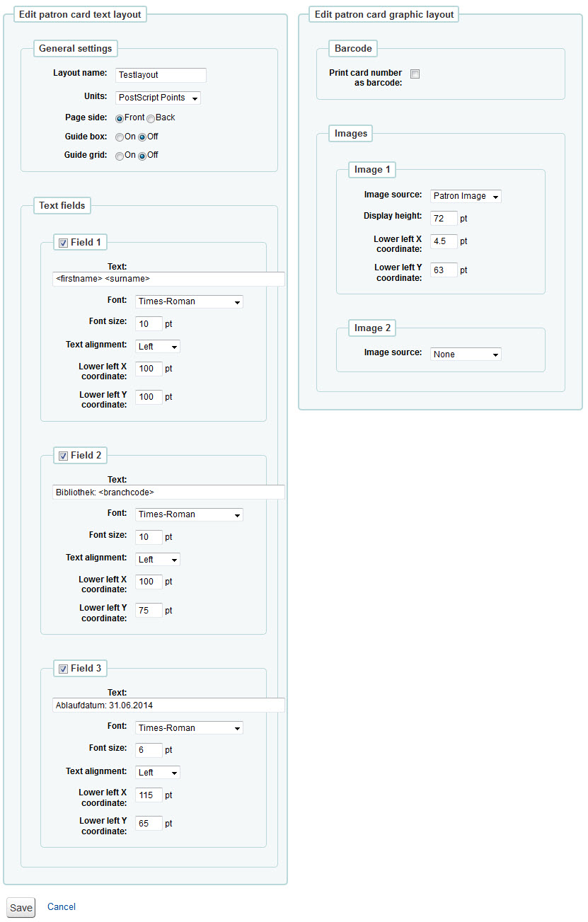 Hi Chris, was not sure how to report best, so I have created INSERTS of the data with workbench: INSERT INTO `creator_layouts` (`layout_id`,`barcode_type`,`start_label`,`printing_type`,`layout_name`,`guidebox`,`oblique_title`,`font`,`font_size`,`units`,`callnum_split`,`text_justify`,`format_string`,`layout_xml`,`creator`) VALUES (20,'CODE39',1,'BAR','Testlayout',0,1,'TR',10,'POINT',0,'L','barcode','<opt page_side=\"F\" units=\"POINT\">\n <images name=\"image_1\" Dx=\"72\" Ox=\"0\" Oy=\"0\" Sx=\"0\" Sy=\"0\" Tx=\"4.5\" Ty=\"63\">\n <data_source image_name=\"none\" image_source=\"patronimages\" />\n </images>\n <text><firstname> <surname></text>\n <text enable=\"1\" font=\"TR\" font_size=\"10\" llx=\"100\" lly=\"100\" text_alignment=\"L\" />\n <text>Bibliothek: <branchcode></text>\n <text enable=\"1\" font=\"TR\" font_size=\"10\" llx=\"100\" lly=\"75\" text_alignment=\"L\" />\n <text>Ablaufdatum: 31.06.2014</text>\n <text font=\"TR\" font_size=\"6\" llx=\"115\" lly=\"65\" text_alignment=\"L\" />\n</opt>\n','Patroncards'); INSERT INTO `creator_templates` (`template_id`,`profile_id`,`template_code`,`template_desc`,`page_width`,`page_height`,`label_width`,`label_height`,`top_text_margin`,`left_text_margin`,`top_margin`,`left_margin`,`cols`,`rows`,`col_gap`,`row_gap`,`units`,`creator`) VALUES (24,0,'Testtemplate1','Default description',0,0,0,0,0,0,0,0,0,0,0,0,'POINT','Patroncards');