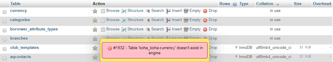 Created attachment 78177 [details] Screenshot phpmyadmin After upgrading from 17.11.08 to 18.05.02 we get the following software error on the intra: Software error: Template process failed: undef error - DBIx::Class::Storage::DBI::_dbh_execute(): Table 'koha_koha.branches' doesn't exist in engine at /usr/share/koha/lib/Koha/Objects.pm line 269 Users can't login on the OPAC and a search from the opac throws the following error: DBIx::Class::Storage::DBI::_dbh_execute(): Table 'koha_koha.branches' doesn't exist in engine at /usr/share/koha/lib/Koha/Objects.pm line 129 It seems like there went something wrong during the upgrade process. With phpmyadmin we can see that the table 'koha_koha.branches' is still there but the collation is shown as in-use. If we try to select this table we get the following error: #1932 - Table 'koha_koha.branches' doesn't exist in engine The same error occurs on three other tables: borrower_attribute_types categories currency