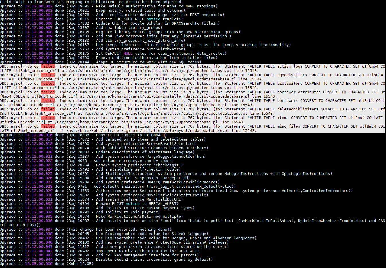 (In reply to Michael Oehrlich from comment #4) > Created attachment 78330 [details] > Alter Table not working On this screenshot: "Index column size too large. The maximum column size is 767 bytes. at /usr/share/perl5/DBIx/RunSQL.pm line 273." (To help searching this issue)