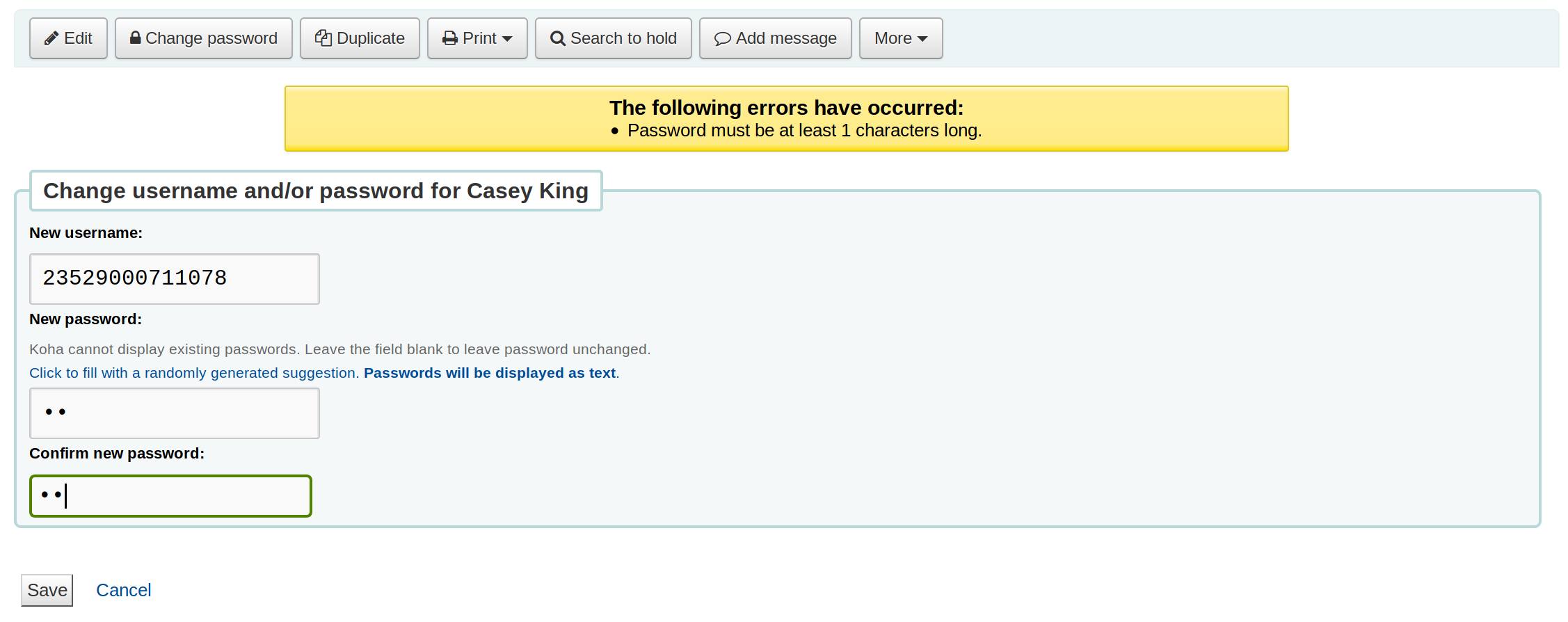 Created attachment 78427 [details] Error message when changing password Applied the patch, restarted plack, apache and memcached and attempted to set a patron password of 2 characters after changing the sysprefs as per the test plan. I'm getting a very confusing error message saying that I'm not entering two characters even though I am. I tried setting the minPasswordLength syspref to one but it then complains that I'm not entering at least 1 character. This is also true if I type in a password with two characters. It looks like it's still searching for three characters when changing patron passwords.