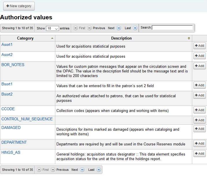 Created attachment 82181 [details] [review] Bug 21803: Redesign authorized values interface This patch redesigns the authorized values management interface. The primary change is that the initial view of authorized values is now a table listing all authorized values categories and their descriptions. Descriptions have been added or updated according to the text of the manual. To test, apply the patch and go to Administration -> Authorized values. - You should see a table of authorized values displayed in a DataTables-formatted table. - Click a category. You should be taken to the list of authorized values for that category. If there are none defined you should see a message saying so, including a button to add one. - Click the "Add" button next to an authorized value category. It should take you to the form for adding an authorized value to that category.