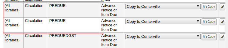 Created attachment 83225 [details] Screenshot showing multiple rows for PREDUE notice Each message type (email, phone, print, sms) has a separate row on Home › Tools › Notices & slips. To replicate: 1) Go to Home › Tools › Notices & slips 2) Choose a letter to edit, e.g. PREDUE. Note that there is only a single row. 3) Click the edit button on the notice. 4) Expand the 'Print' section. Put text into the Message subject and Message body text areas. 5) Click save, this will take you back to the 'Notices & slips' page. 6) An extra row shows for this notice.