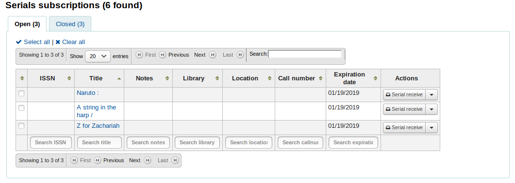 Created attachment 85208 [details] [review] Bug 22156: (17.11.x) Subscription result list sorts on "checkbox" by default This patch adds default sorting by title to the subscription search results list. Previously no default sort was defined, so it defaulted to sorting by the first column in the table. To test, apply the patch and go to Serials. - Perform a search of subscriptions which will return multiple results. - Confirm that the table of open subscriptions is sorted by default by title ascending. - Confirm the same for the table of closed subscriptions. Signed-off-by: Jose-Mario Monteiro-Santos <jose-mario.monteiro-santos@inLibro.com> Signed-off-by: Katrin Fischer <katrin.fischer.83@web.de>