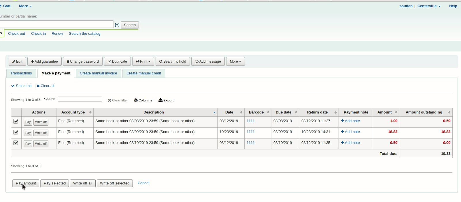 (In reply to Caroline Cyr La Rose from comment #2) > I'm not sure if this is the same bug as the one I'm experiencing. > > I'm trying to understand the new "change to give" feature. If I try to pay a > 19,33$ charge with a 20$ bill, I get a notification saying I owe 0,67$ to > the user, I confirm, and then the payment fails because "You must pay a > value less than or equal to 19.33". > > I attached a gif showing what I mean. > > To recreate: > 1 - Add a fine or find a patron owing money > 2 - Go to pay fines, pay amount > 3 - Set amount collected higher than amount paid > 4 - Note you get a confirmation modal, confirm > 5 - payment fails Maybe this one: https://bugs.koha-community.org/bugzilla3/show_bug.cgi?id=26076