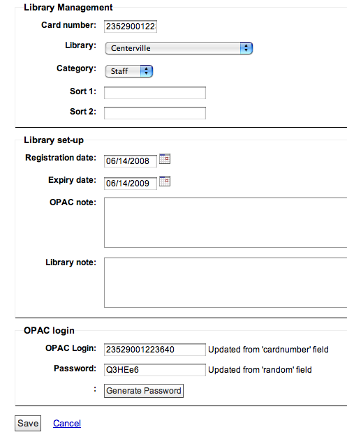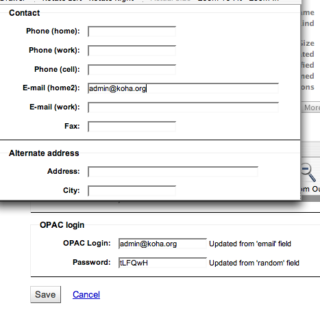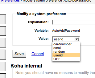 ---- Reported by mason@kohaaloha.com 2008-06-11 07:38:58 ---- The idea of this feature is to allow userid and password be populated automatically from other fields, when adding a new user. this has a few other benefits 1) in combination with user-permissions locks userid and password fields from manually being changed 2) populates password field with randomly generated passwords the feature currently uses the jscript onkeyup() function to update the destination fields character by character - when the source field is changed ---- Additional Comments From mason@kohaaloha.com 2008-06-11 07:41:22 ---- Created an attachment AutoAddUserid syspref example ---- Additional Comments From mason@kohaaloha.com 2008-06-11 07:42:03 ---- Created an attachment AutoAddPassword syspref example ---- Additional Comments From mason@kohaaloha.com 2008-06-11 07:48:12 ---- Created an attachment example of 'email' src field populating 'userid' field, and 'password' field populated with random value ---- Additional Comments From mason@kohaaloha.com 2008-06-11 20:03:17 ---- Hi Joe On 2008/06/12, at 7:17 AM, Joe Atzberger wrote: Mason -- There are a handful of problems I see with this patch. Uses EXPR in a way guaranteed to create multiple warnings unless both of these new features are ON. Good call, i didn't consider the log warnings here, i will fix this Uses EXPR at all. Hmm, i dont understand your point here, is *any* EXPR usage bad, or just unneeded EXPR usage? I'm sure i *could* rewrite this mod to not use EXPR tags, but the template would be much more confusing than using EXPR tags. And i would need to introduce 8-ish? new TMPL_VARS to the script if i removed the EXPR tags, is that a better solution?? Or do you know a better way still to achieve this? Did i use an unneeded EXPR tag, instead of a VAR tag? Adds meaninglessness (e.g. "home111", "email33") to labels. Sure, late-night last minute typo there, i will fix this Changes sort order of branches to be by code instead of the name that actually displays. I.E., allows apparent disorder in display. Good spotting, i did seem to miss Ryan's recent branch-sort commit there -for my $branch (sort { $branches->{$a}->{branchname} cmp $branches->{$b}->{branchname} } keys %$branches) { +foreach my $branch (sort keys %$branches) { Uses onkeyup instead of something more logical. (Not every keypress changes value.) Sorry - my jscript isnt that hot, so i welcome a better way to do this, any suggestions for a better jscript function/solution? FYI: There are many examples of onkeyup() being used in this fashion, so it seems to be a commonly used/accepted solution? -> http://www.w3schools.com/jsref/jsref_onkeyup.asp The whole idea of the proposed CAN_user_nonstaffaccess, as I interpret it, is to block updates to nonstaff accounts unless the permission is granted to the operator. Is that the intent? I don't understand the rationale for doing it this way, since the user should probably not be allowed to memberentry at all in that case. Is there really a need to allow, for example, CAN_user_staffaccess but NOT CAN_user_nonstaffaccess? There might be.. But there *is* a need to disallow access to *all* category_types, which was the goal of this additional user-perm. I realise there are a few ways to achieve this too.. One way would be to change the existing 'staff_access' perm to handle all cat_types, not just staff - (the perm would need to be renamed too) I think this is the best idea, but some people might not like that the 'staffaccess' user-perm's behavior is changed, i dont yet know, so i didnt want to fiddle with it. So adding a new user-perm was the less invasive initial commit. rather than the best commit But if people agree, changing the existing staffaccess user-perm to allow/disallow *all* cat-types, and updating its name to reflect the new behavior would be the best solution ( 'editlogins' perhaps?) Any comments on this last point peoples? Thanks for checking my patch Joe, You did spot a few things that i overlooked. Mason ---- Additional Comments From mason@kohaaloha.com 2008-06-13 09:01:41 ---- Created an attachment Adding a jscript button to generate a new random password, but only if 'staffaccess' user-perm is on ---- Additional Comments From nengard@gmail.com 2009-12-17 00:52:15 ---- I need a clarification about this. Does this mean that you have to add those preferences to local use and set them the way you're suggesting? or are these system preference supposed to be there for all? --- Bug imported by chris@bigballofwax.co.nz 2010-05-21 00:48 UTC --- This bug was previously known as _bug_ 2237 at http://bugs.koha.org/cgi-bin/bugzilla3/show_bug.cgi?id=2237 Imported an attachment (id=578) Imported an attachment (id=579) Imported an attachment (id=580) Imported an attachment (id=581) Actual time not defined. Setting to 0.0 The original reporter of this bug does not have an account here. Reassigning to the person who moved it here: chris@bigballofwax.co.nz. Previous reporter was mason@kohaaloha.com. CC member arm@hanover.ca does not have an account here The original submitter of attachment 578 [details] is unknown. Reassigning to the person who moved it here: chris@bigballofwax.co.nz. The original submitter of attachment 579 [details] is unknown. Reassigning to the person who moved it here: chris@bigballofwax.co.nz. The original submitter of attachment 580 [details] is unknown. Reassigning to the person who moved it here: chris@bigballofwax.co.nz. The original submitter of attachment 581 [details] is unknown. Reassigning to the person who moved it here: chris@bigballofwax.co.nz.