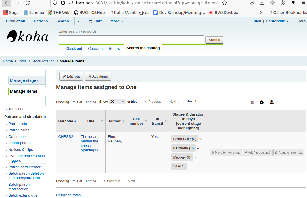 Created attachment 133363 [details] Tools -Stock Rotation -Manage Items The stages shwo where it is at in terms of rotation, but I cannot see where the item physically is I was thinking the 'In transit' column should show holding library and transfer date (in transit from A to B since 01-01-1900)
