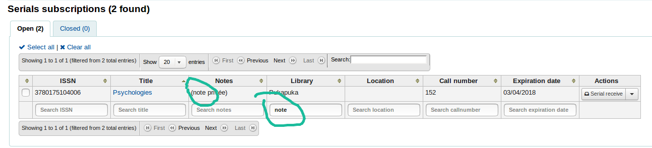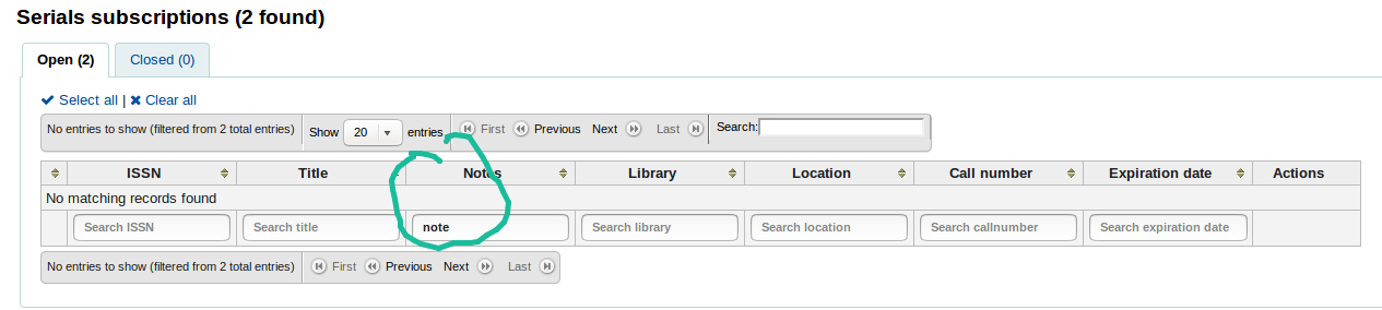 Created attachment 87315 [details] Sceenshot 1 - search failed On the serial subscription page result, the filters search the column on its left. Could it be the first column with check box but without filter that create the gap ? See the 2 screenshots attached : - #1 : failed searching "notes" using the filter on "Notes" column - #2 : 1 result (as expected) searching "notes" using the filter on "Library" column