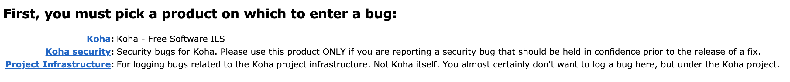 Created attachment 89957 [details] screenshot of the "select product" text on bugzilla When filing a bug, we see these words: First, you must pick a product on which to enter a bug: Koha: Koha - Free Software ILS Koha security: Security bugs for Koha. Please use this product ONLY if you are reporting a security bug that should be held in confidence prior to the release of a fix. Project Infrastructure: For logging bugs related to the Koha project infrastructure. Not Koha itself. You almost certainly don't want to log a bug here, but under the Koha project. I find "Pick a product" and "Use this product" to be a bit confusing in this context. Here's some alternative phrasing to consider. First, you need to decide where to enter a bug: Koha: Koha Free Software ILS (integrated library system) Koha security: Security bugs for Koha. Use this ONLY if you are reporting a security big that should be held in confidence prior to the release of a fix. Project Infrastructure: Bugs related to the Koha project infrastructure (eg bugzilla, gitlab, or the project website. Not for Koha itself. You almost certainly don't want to log a bug here, but under the Koha project.