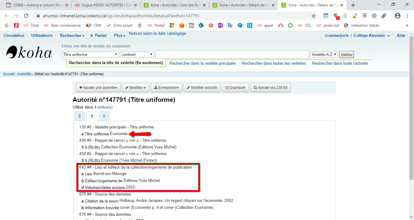 (In reply to Katrin Fischer from comment #1) > Hi Alexandre, I believe this is for UNIMARC? > Could you add an example record or field and which search you want to be > changed? I am a little confused on where you want the info to appear. Hi Katrin, Alexandre no longer works for our company now. The display concerns Marc21. In a search result in the Authorities module (and also when cataloguing) if two authorities of the Uniform Title type have the same title, they cannot be easily distinguished without consulting field 643. I attach 3 screenshots. If we could have in the search result a configurable column like AdditionalFieldsInZ3950ResultSearch, this would be perfect for adding additional information. Do not hesitate to contact me if you need more information Regards Marjorie